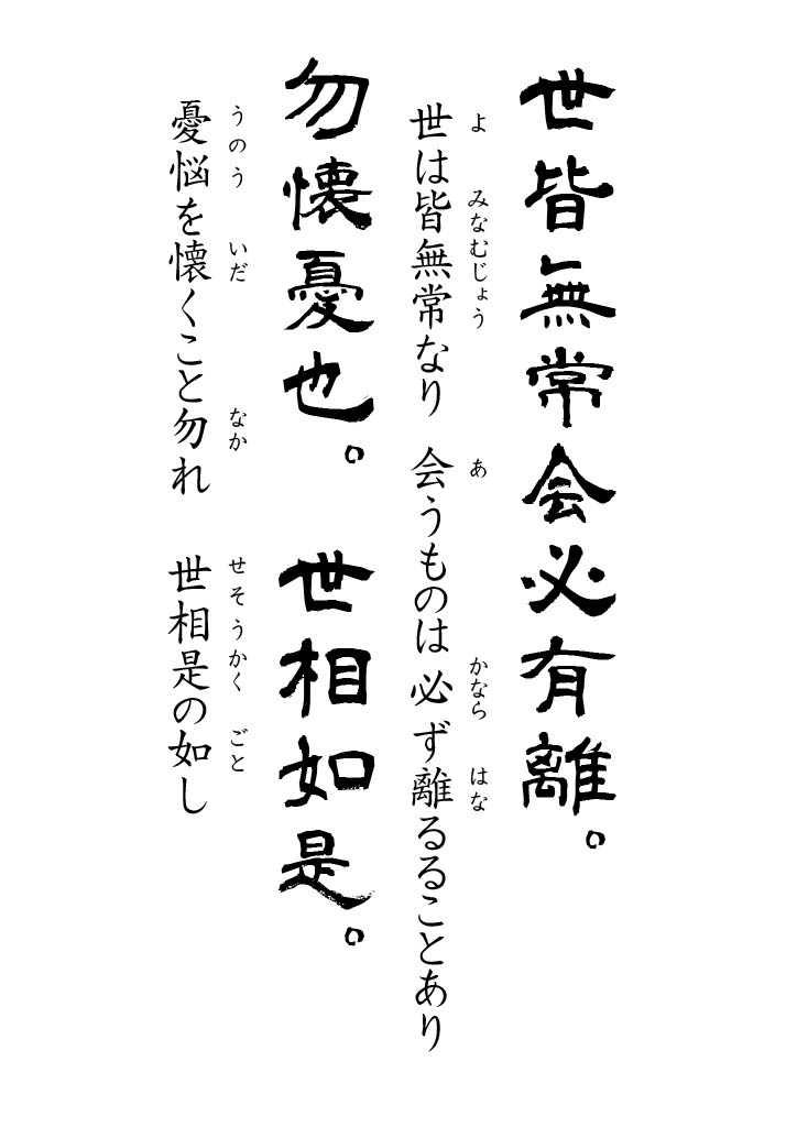 内容としては、諸行無常(世の中は常に変化していく)を心得たうえで人と人の出会いを大切にしていこうと考えるお釈迦様の優しいお気持ちを表している言葉です。